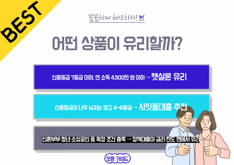 • 신용등급 7등급 이하, 연 소득 4,500만 원 이하 → 햇살론 유리